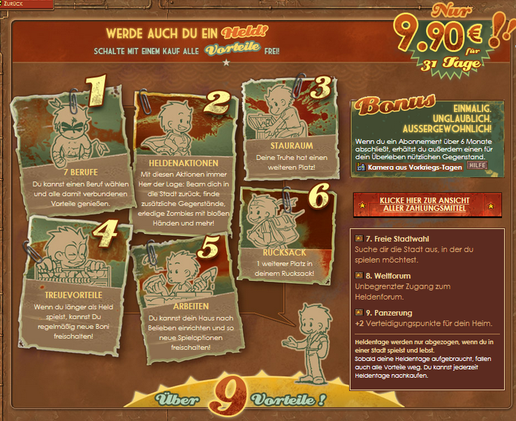 Dieses Konzept unterscheidet sich schon in seiner kooperativen Natur fundamental von den meisten anderen F2P-Spielen. Dementsprechend anders verhält es sich auch mit den zu erwerbenden virtuellen Gütern, die hier in Form sogenannter “Heldentagen” angeboten werden. Spieler können ein Kontingent dieser Tage erwerben und werden somit für diese Zeit im Spiel zu “Helden” mit besonderen Stärken und Fähigkeiten. Diese nutzen unmittelbar der gesamten Gruppe. Somit werden zahlende Spieler hier nicht als solche gesehen, die sich “den Sieg ja nur erkauft” hätten, sondern eben tatsächlich als große Wohltäter. Von Belanglosigkeit für den interaktiven Kern kann hier ohnehin keine Rede sein, denn die Heldenzusammensetzung hat direkte Auswirkungen auf die foreninternen Absprachen. In völlig zufällig zusammengesetzten Städten wäre das Thema “Pay-To-Win” in der Regel ebenso vom Tisch gewesen.