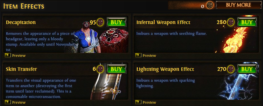 Der Grund dafür, dass der Verkauf visueller Gimmicks dennoch erfolgreich sein kann, liegt in der Natur des Designs selbst: Der Kern des Spiels ist geknüpft an die Jagd nach immer höheren Charakterwerten und damit besseren Ausrüstungsgegenständen (wie sich schon anhand des Namens des Entwicklers Grinding Gear Games vermuten lässt). Hier sind die Items – zu denen übrigens auch die Fähigkeiten in Form von “Skill-Gems” zählen – als zentrale Statussymbole schon im System als wichtigste Komponente angelegt. Also möchte der Spieler natürlich, dass diese dann auch schön aussehen. Dazu kommt darüber hinaus die soziale Komponente, denn das Spiel ist nur online spielbar und in jeder Instanz einer Stadt kann der eigene Avatar von anderen gerade aktiven Spielern bewundert werden – oder eben auch nicht. Natürlich ist ein gerade gefundenes und extrem seltenes Schwert schon an sich eine tolle Sache, aber mit einem strahlenden Partikeleffekt belegt bekommt es nochmal eine ganz andere Wirkung.