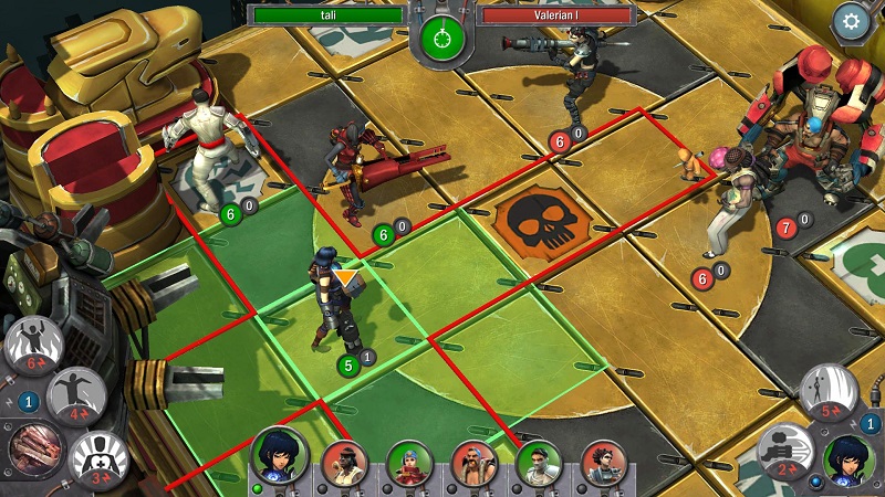 Häufig wird Aerena als “rundenbasiertes MOBA” beschrieben. Dies ist insofern durchaus zutreffend, als jeder Spieler jeweils eine Gruppe aus drei Helden mit spezifischen Spezialfähigkeiten kontrolliert. Jedem Helden steht dabei ein Spezialangriff und ein “Ultimate” zur Verfügung. Während “Crank” beispielsweise seine Feinde herum- und auch gerne mal von der nur 7 mal 7 Felder großen Arena-Plattform herunterschubst, kann “Aurora” mehrere in einer Reihe hintereinander stehende Gegner zugleich angreifen. Jeder Held hat zudem ein eigenes Angriffsmuster, wodurch die räumliche Kontrolle in den Mittelpunkt gerückt wird und das Spiel stellenweise wie eine modernisierte Schach-Variante wirkt. Allerdings gibt es hier versteckte Information in Form der (mittlerweile dauerhaft freischaltbaren) Shells, die der Spieler mit genügend “Aether”, der beispielsweise auf bestimmten Feldern auf dem Schlachtfeld gesammelt wird, auslösen kann. Drei von dutzenden zur Auswahl stehenden Shells dürfen pro Partie bereitgehalten werden. Mit deren Hilfe kann beispielsweise ein gegnerischer Held direkt geschädigt oder ein eigener zum finalen Schlag direkt neben das gegnerische Luftschiff, das es letztlich zu zerstören gilt, teleportiert werden.
