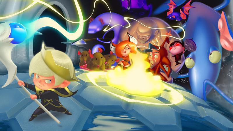 Auch wenn sich der zentrale Mechanismus des Schubsens schon unmittelbar interessanter als ein bloßes gegenseitiges Eingedresche darstellt, so liegt die wahre Komplexität des Spielsystems dann doch in den allesamt um diesen Kern herum aufgebauten unterstützenden Spielregeln: den Zaubern. Dank seines magischen Stabes kann Auro die Elemente Eis, Feuer und Wind manipulieren. Allerdings gilt auch hier die Devise der indirekten Aktionen. Es werden nicht etwa Feuerbälle auf Monster geschleudert, sondern Flammen auf dem Spielfeld platziert, sodass es im Anschluss erst einmal gilt, die Feinde in vorteilhafte Positionen zu locken, um sie per Schubser oder zusätzlichem Zauber in diese zu befördern. Nun kann jedoch alternativ zuvor ein Teil des Bodens mit Eis überzogen werden, über das Monster auch mehrere Felder weit ins Feuer rutschen. Auf einer weiteren Kombinationsebene könnte ein Luftwirbel inmitten der Eisfelder platziert werden, der Monster bei Kontakt extra weit durch die Luft befördert – und dann wiederum ins Feuer oder Wasser, in einen weiteren Wirbel oder sogar auf den Kopf eines anderen Monsters, von dem aus gleich noch weiter gehüpft wird. Die insgesamt neun Zaubersprüche, von denen in jeder Partie eine Handvoll zufallsbasiert verfügbar ist, interagieren so auf unzählige Arten und Weisen miteinander sowie dem – teils durch sie selbst erzeugten – Terrain.