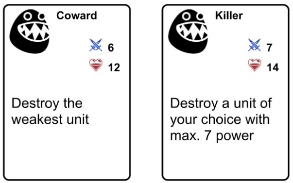 Des Weiteren sollten Karten grundsätzlich persistent im Spiel verweilen, um die zu treffenden Entscheidungen im Verlauf einer Partie komplexer und interessanter werden zu lassen. Deshalb erlegten wir uns schon relativ früh in der Konzeptionsphase die Regel auf, dass jede Karte für einen Charakter stehen sollte.