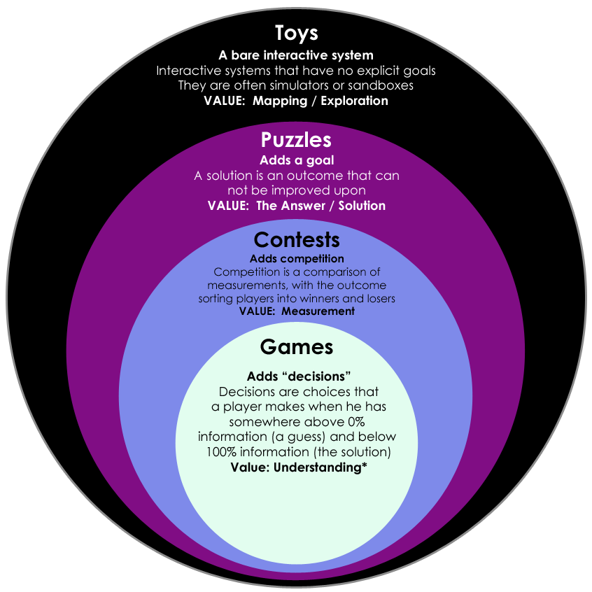 - Spiel meint ein System von Regeln zur Erzeugung eines Wettkampfes bestehend aus nicht-trivialen Entscheidungen mit permanenten Konsequenzen im Kontext eines spezifischen zu erreichenden Ziels.