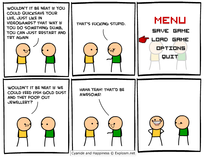 June 3, 2013Vorbemerkung 1: Es geht tatsĂ€chlich um Spiele. Genauer gesagt um digitale Single-Player-Spiele. NatĂŒrlich wĂ€ren 85 Stunden lange Fantasy-Simulationen ohne Quicksave bzw. jedenfalls persistente SpeicherstĂ€nde ein schlechter Scherz. Das Problem ist, dass regelmĂ€Ăig nicht konsequente Simulationen erscheinen, sondern Spiele bzw. Software mit spielerischen Elementen, denen die Simulation als Diktator aufgezwungen wurde. Eng damit verbunden ist das Problem storybasierter “Spiele”: Der “Spieler” soll natĂŒrlich die Handlung (vollstĂ€ndig) erleben, also muss er auch jederzeit laden können. Der (Un-)Sinn derartiger Systeme ist jedoch einen eigenen Artikel wert.